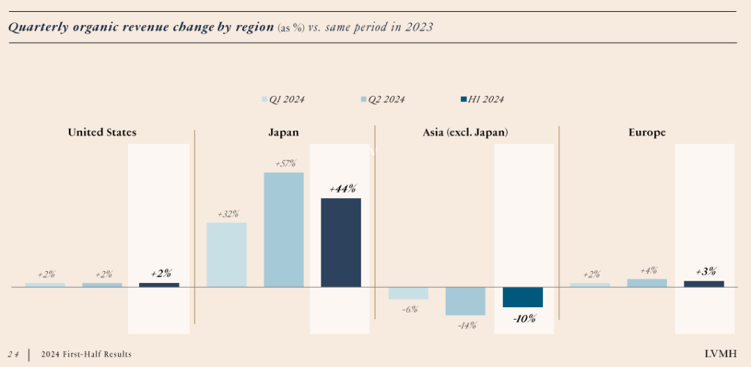 LVMH集團各區(qū)域收入有機變動 圖源:LVMH集團2024年H1財報