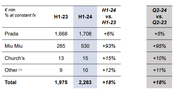Prada集團各品牌業(yè)務(wù)表現(xiàn) 圖源:Prada集團2024年H1財報