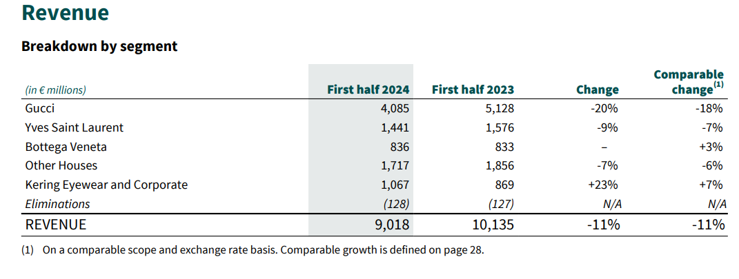 開云集團各品牌業(yè)務(wù)表現(xiàn) 圖源:開云集團2024年H1財報