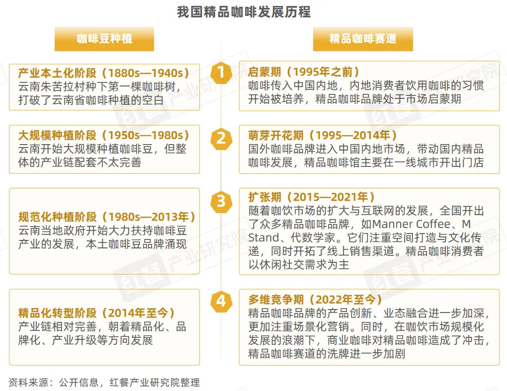 紅餐產(chǎn)業(yè)研究院觀察到,我國精品咖啡賽道發(fā)展歷程可分為四大階段,當(dāng)前已經(jīng)步入多維競爭期,整個(gè)賽道的“洗牌”正在進(jìn)一步加劇。