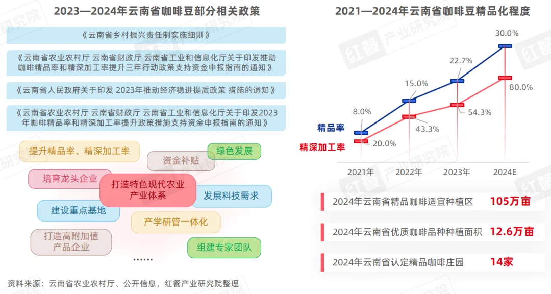 云南當(dāng)?shù)卣疄榭Х榷巩a(chǎn)業(yè)的發(fā)展提供了政府扶持,近些年出臺(tái)了不少針對(duì)性政策,在提升咖啡豆精品率、精深加工率、培育龍頭企業(yè)、建設(shè)重點(diǎn)基地、綠色發(fā)展等方面提供政策與資金支持,以協(xié)同創(chuàng)新的方式,產(chǎn)學(xué)研管一體化推進(jìn)云南咖啡豆產(chǎn)業(yè)全鏈條發(fā)展。