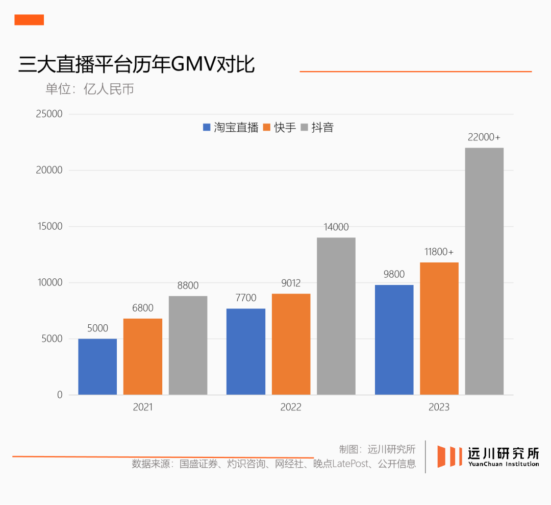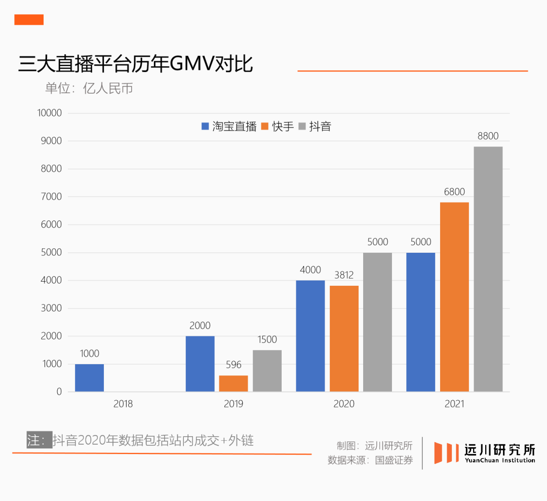 2021年程道放升任淘寶直播一把手,正值抖音和快手后來居上。當(dāng)年淘寶直播GMV達(dá)到5000億,但快手與抖音電商的GMV分別是6800億與8800億。