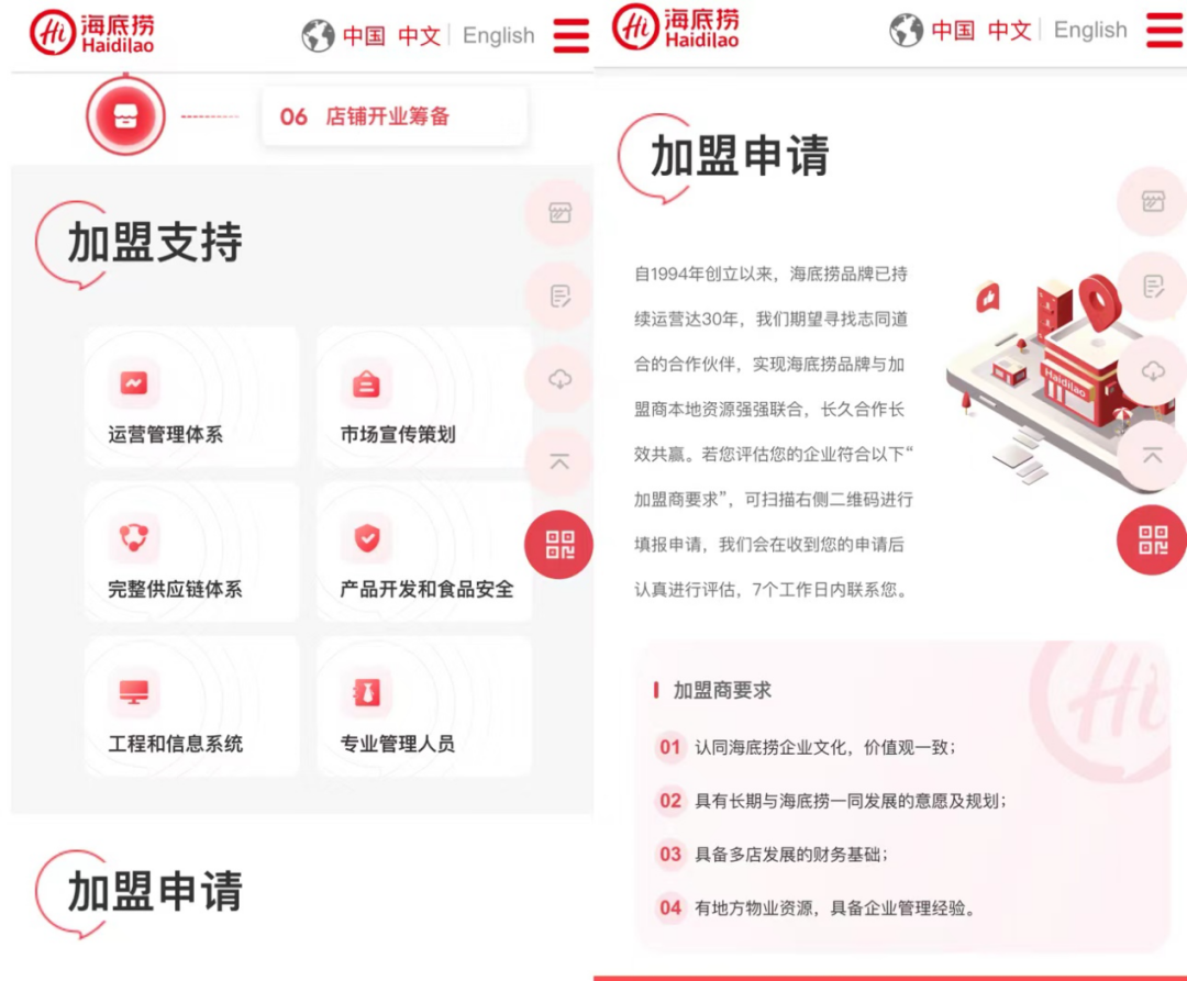 鑒于此前擴(kuò)張的結(jié)果不盡人意,海底撈的態(tài)度轉(zhuǎn)為謹(jǐn)慎,今年3月,海底撈首次宣布開放加盟,進(jìn)攻下沉市場(chǎng),以更低風(fēng)險(xiǎn)的方式,重新釋放擴(kuò)張信號(hào)。