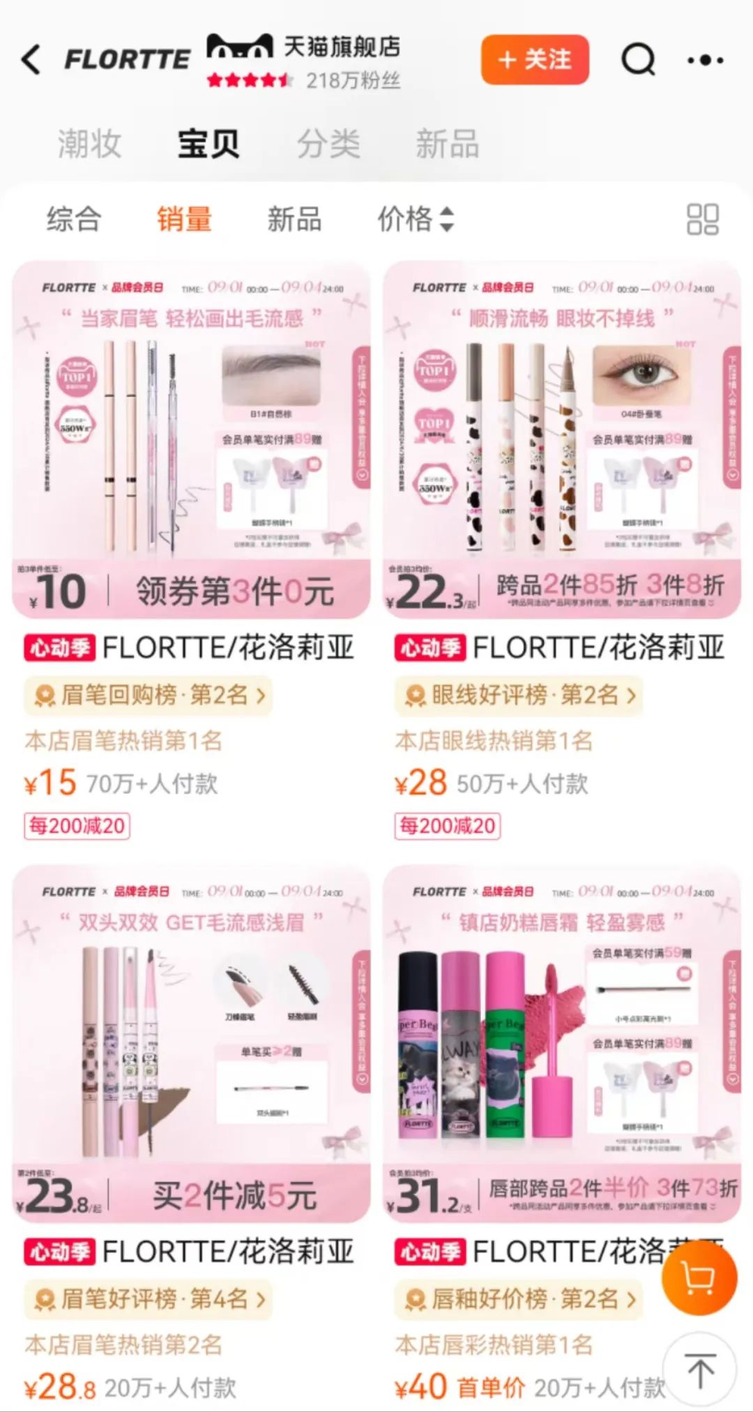 目前,天貓花洛莉亞旗艦店粉絲達(dá)218萬,店內(nèi)銷量最高的產(chǎn)品為眉筆,有超70萬人付款,登上眉筆好評榜第二名,店鋪內(nèi)有6款產(chǎn)品超10萬人購買。