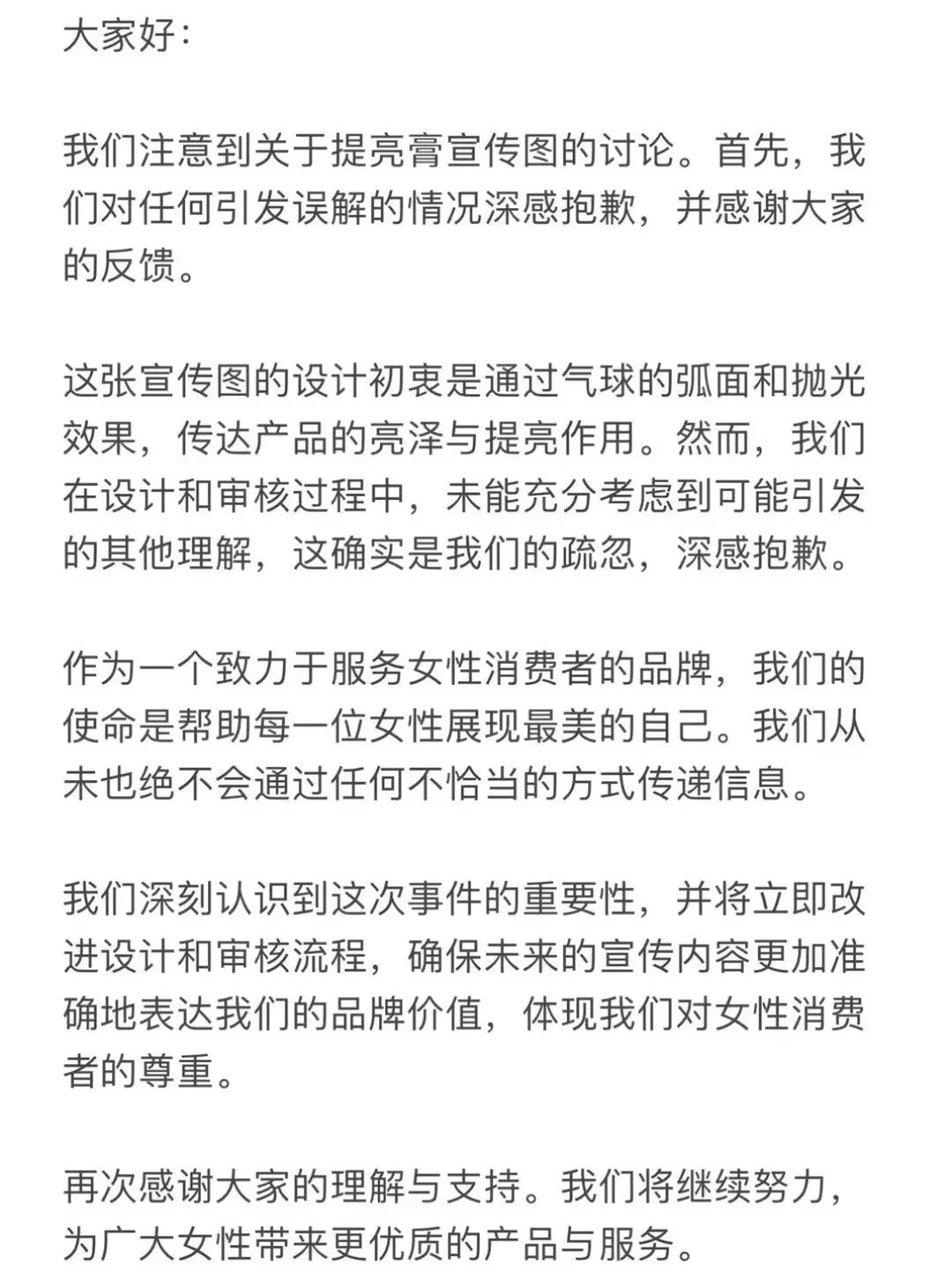 而在產(chǎn)品宣傳設(shè)計圖引起爭議后,黑兔也第一時間在小紅書評論區(qū)回應(yīng)。其表示:“宣傳圖的設(shè)計初衷設(shè)是通過氣球的弧面和拋光效果,傳達(dá)產(chǎn)品的亮澤與提亮作用!蓖瑫r,該品牌也承認(rèn),“在設(shè)計和審核過程中,未能充分考慮到可能引發(fā)的其他理解,向消費者表示抱歉。”值得一提的是,青眼號外發(fā)現(xiàn),今日下午13時,黑兔官方小紅書賬號有關(guān)該產(chǎn)品的宣傳已經(jīng)刪除,最初引起爭議的宣傳圖也已經(jīng)找不到。
