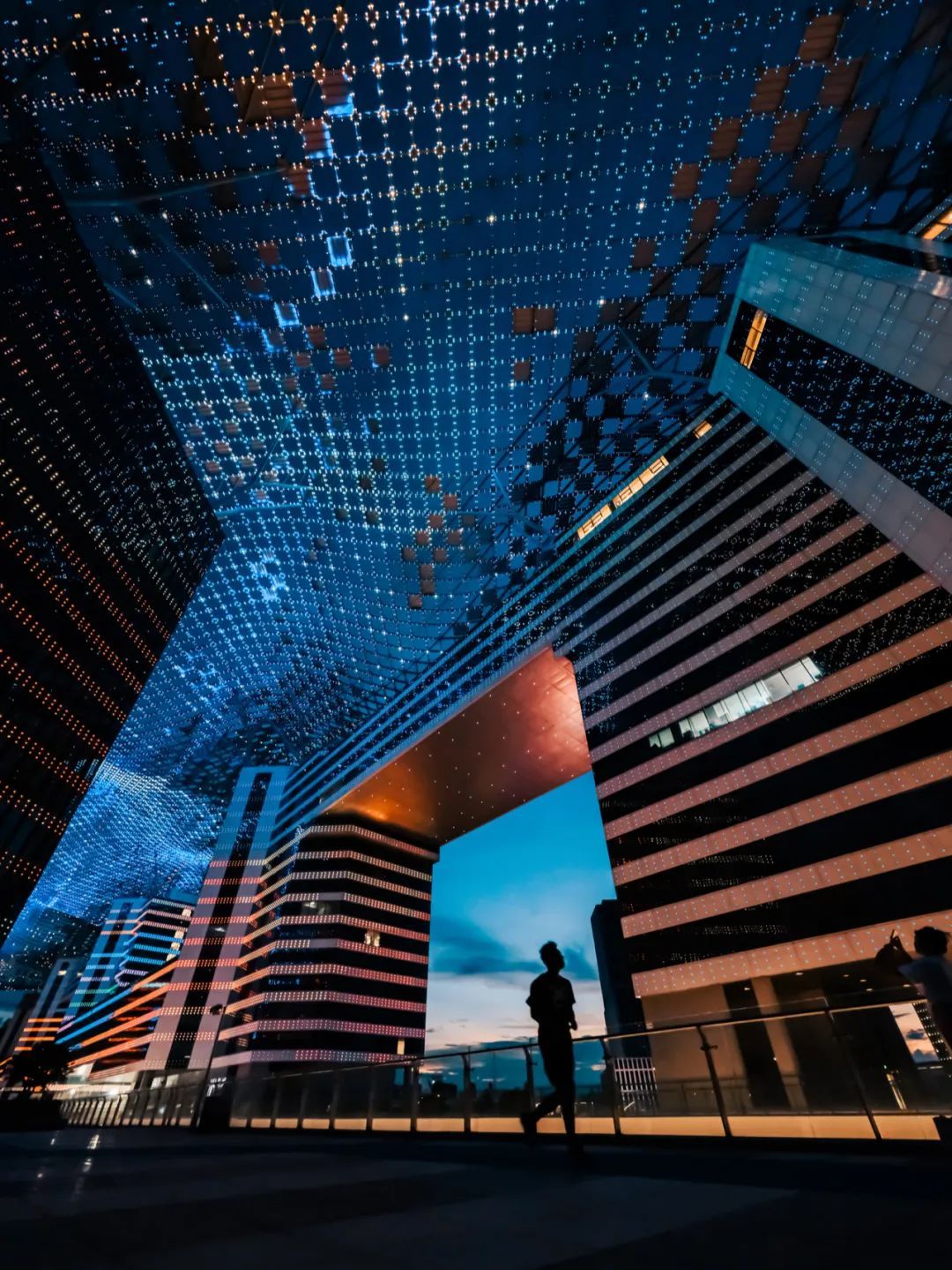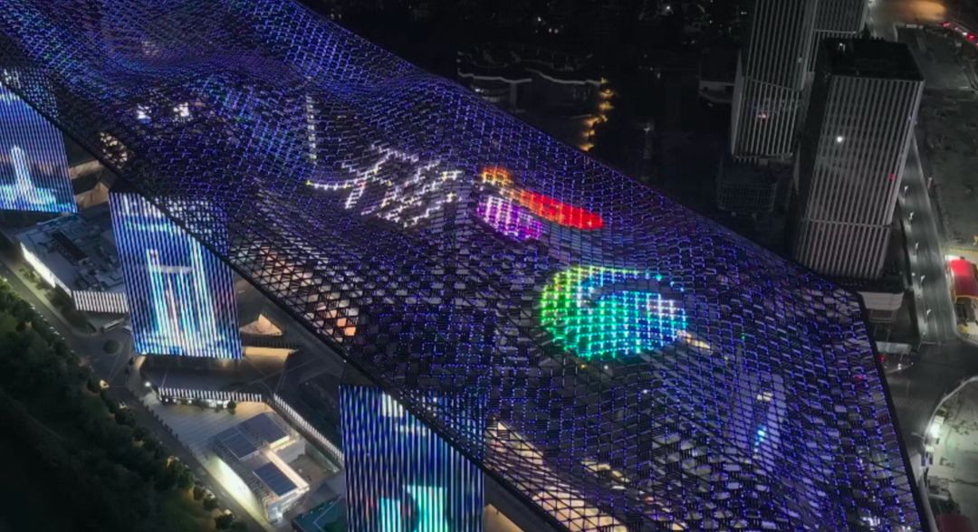 夜幕降臨,13萬(wàn)盞LED燈同時(shí)亮起,整個(gè)頂部星光閃耀,巨大的LED天幕還可輸出圖案、字體、視頻等內(nèi)容,充滿科技感與藝術(shù)感。目前已開啟的「音樂(lè)燈光秀」,完美展現(xiàn)了地標(biāo)建筑與光影藝術(shù)的交融,引發(fā)不小的打卡熱潮。