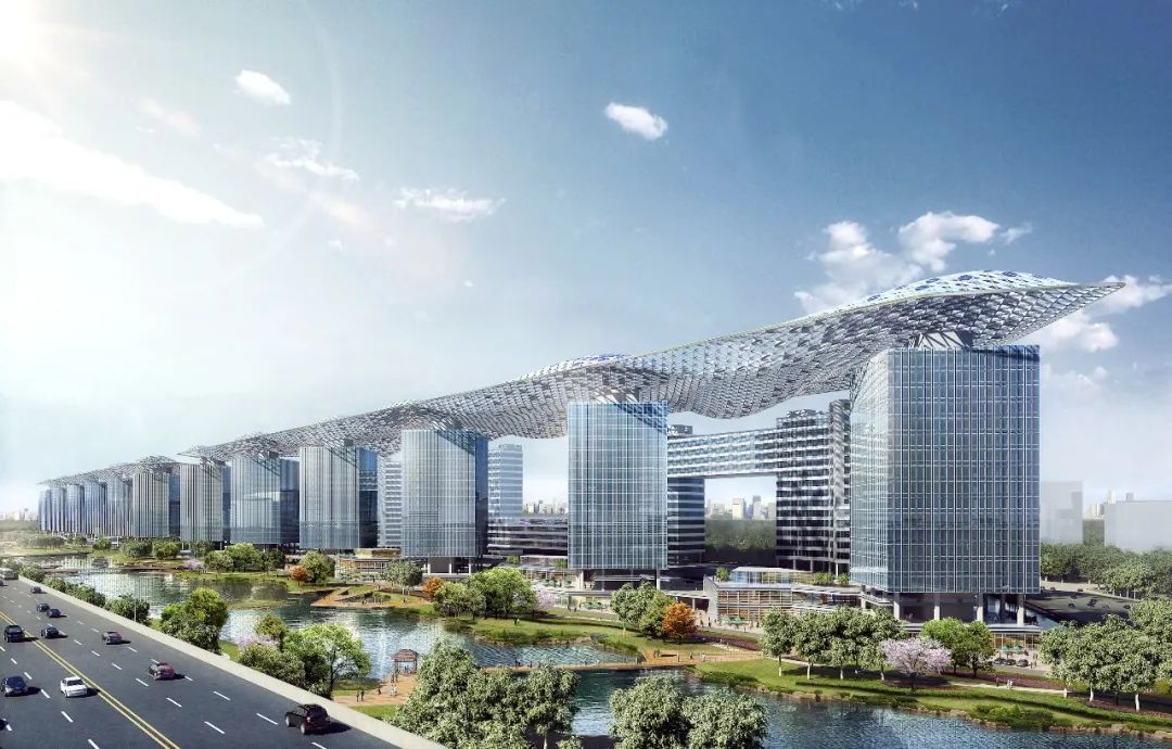 其設(shè)計(jì)理念源自“行云流水”,將23棟塔樓錯(cuò)位排列成兩排沿高速矗立,如同一艘巨艦,共同舉起1.5公里長(zhǎng)的云頂屋面,其波浪狀的設(shè)計(jì)高低起伏,波峰與波谷之間的最大落差達(dá)到18米,將園區(qū)連接成一個(gè)巨構(gòu)長(zhǎng)廊。