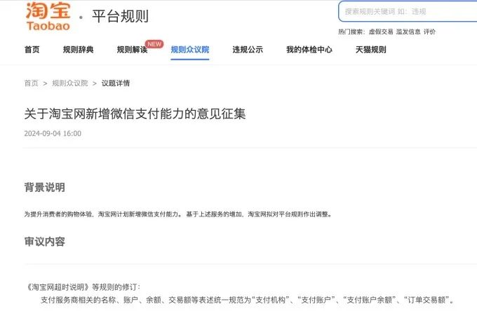 而就在下午,淘寶平臺規(guī)則大廳發(fā)布了《關(guān)于淘寶網(wǎng)新增微信支付能力的意見征集》。為提升消費者的購物體驗,淘寶計劃新增微信支付能力。在意見征集結(jié)束后,淘寶將進行平臺規(guī)則調(diào)整,本次調(diào)整將覆蓋全體淘寶和天貓商家。