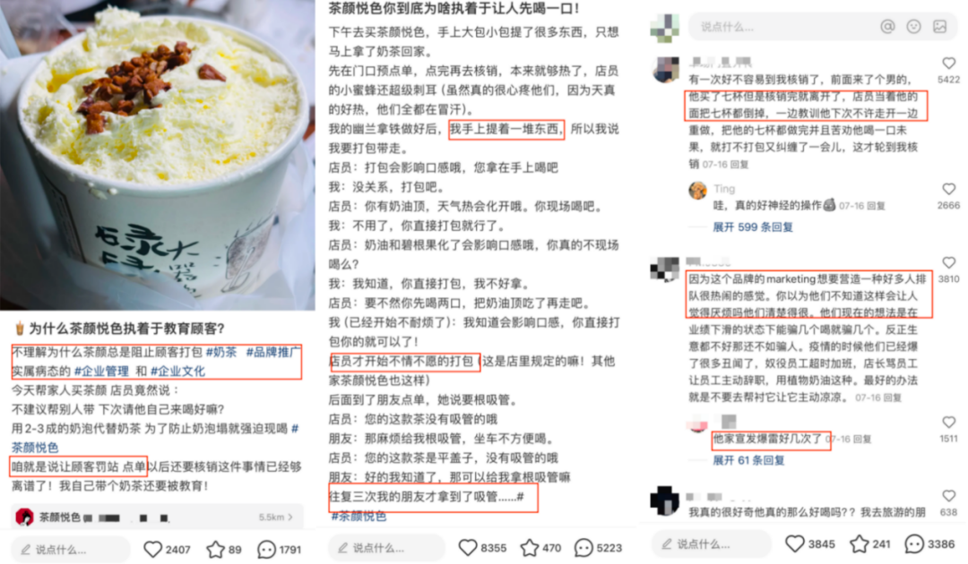 對外彰顯以茶文化為核心、以服務(wù)為宗旨的企業(yè)文化,可它的服務(wù)卻偏離了如今消費者真正的需求。甚至在社交平臺上,關(guān)于“茶顏悅色吐槽帖”層出不窮,不僅有來自消費者的,還有許多來自內(nèi)部員工。