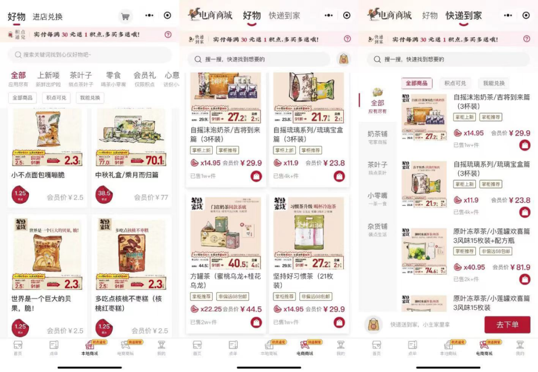 茶顏悅色小程序上,擁有“本地商城”和“電商商城”,從模式上看,分別對應(yīng)“本地到家”和“快遞到家”功能。其售賣商品包括自茶葉子和小零食,快遞到家業(yè)務(wù)還有自搖奶茶和茶顏周邊雜貨可供購買。