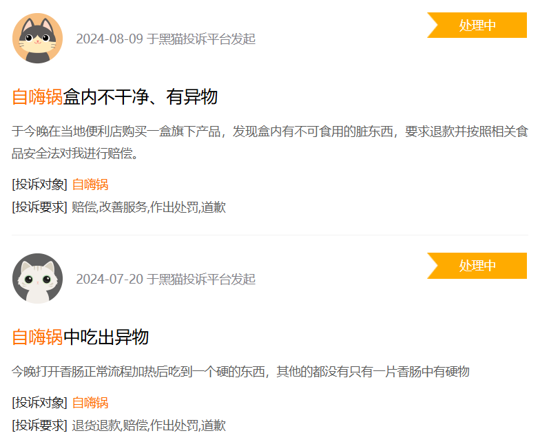 黑貓投訴平臺上,有關(guān)自嗨鍋的投訴量已經(jīng)來到了750條,大多集中在自嗨鍋內(nèi)有異物、食材發(fā)霉、醬料包變質(zhì)等食安問題。