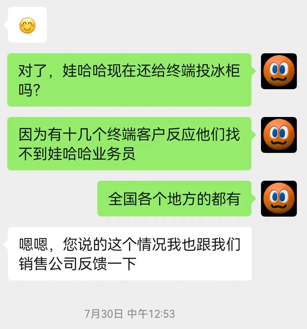 7月30日,全食在線與娃哈哈相關負責人進行了冰柜投放問題的咨詢,娃哈哈方面非常重視該問題,并表示將反饋給銷售公司。