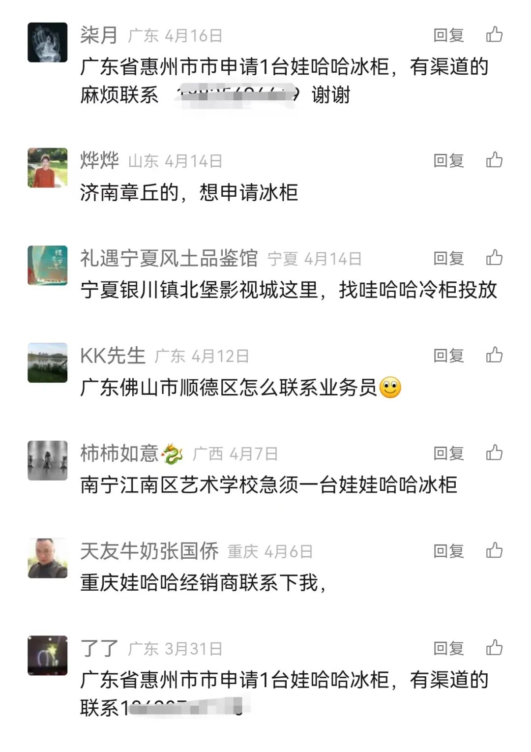 為此全食在線專門寫了一篇《娃哈哈冰柜,很難申請》的文章,后臺留言的都是全國各地終端客戶申請投放的需求。