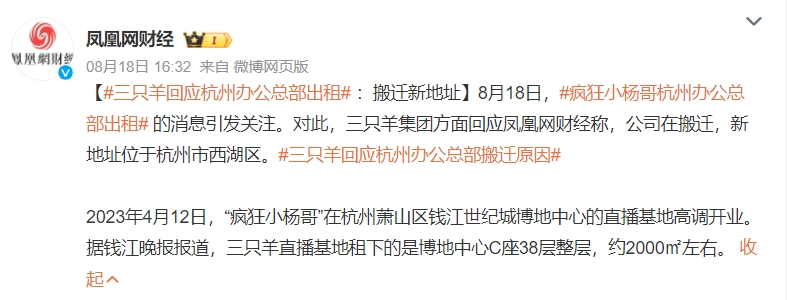8月中旬,又有“瘋狂小楊哥杭州辦公總部出租”、“三只羊回應(yīng)杭州辦公總部出租”等消息沖上熱搜,引發(fā)市場(chǎng)擔(dān)憂頭部主播的生存現(xiàn)狀或不如之前。
