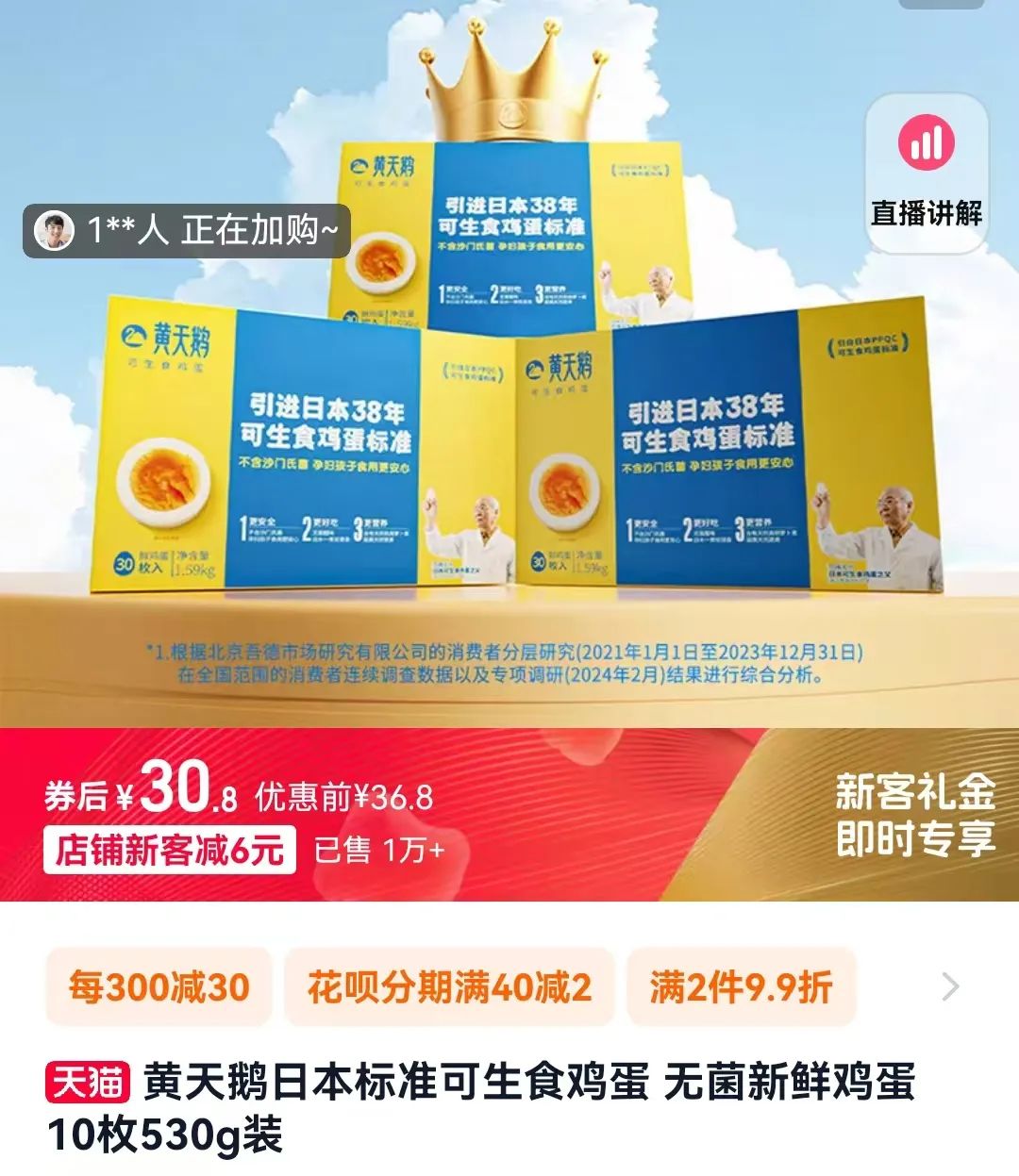 8月29日,「新消費(fèi)101」查看天貓“黃天鵝旗艦店”,發(fā)現(xiàn)“無菌新鮮雞蛋10枚530g裝”新客優(yōu)惠前的價(jià)格為36.8元,也就是3.68元一枚。對(duì)比看,一枚黃天鵝雞蛋是普通雞蛋均價(jià)的5.5倍,稱得上是“蛋中貴族”。