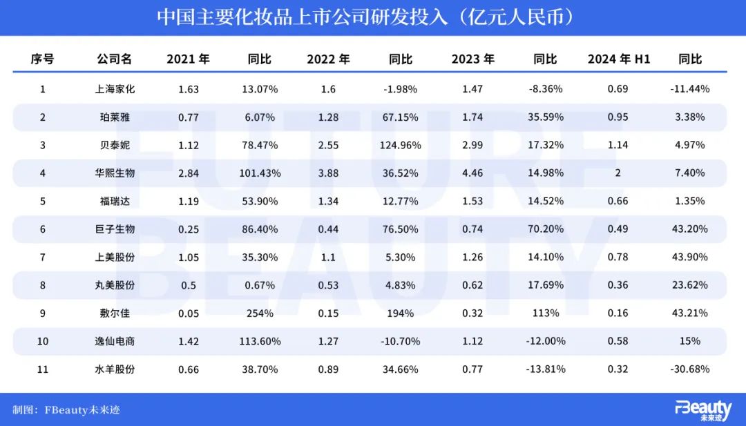 于是在國家政策“綠燈”和市場需求的催化下,中國化妝品企業(yè)的研發(fā)投入持續(xù)增長。據(jù)《FBeauty未來跡》統(tǒng)計顯示,2023年中國主要美妝上市企業(yè)的研發(fā)投入持續(xù)保持雙位數(shù)增長,同比平均增加13.97%,在2024年上半年,11家主要本土上市公司的研發(fā)投入還在持續(xù)增加,其中上美股份、敷爾佳、巨子生物三家企業(yè)研發(fā)費用同比增長40%以上。