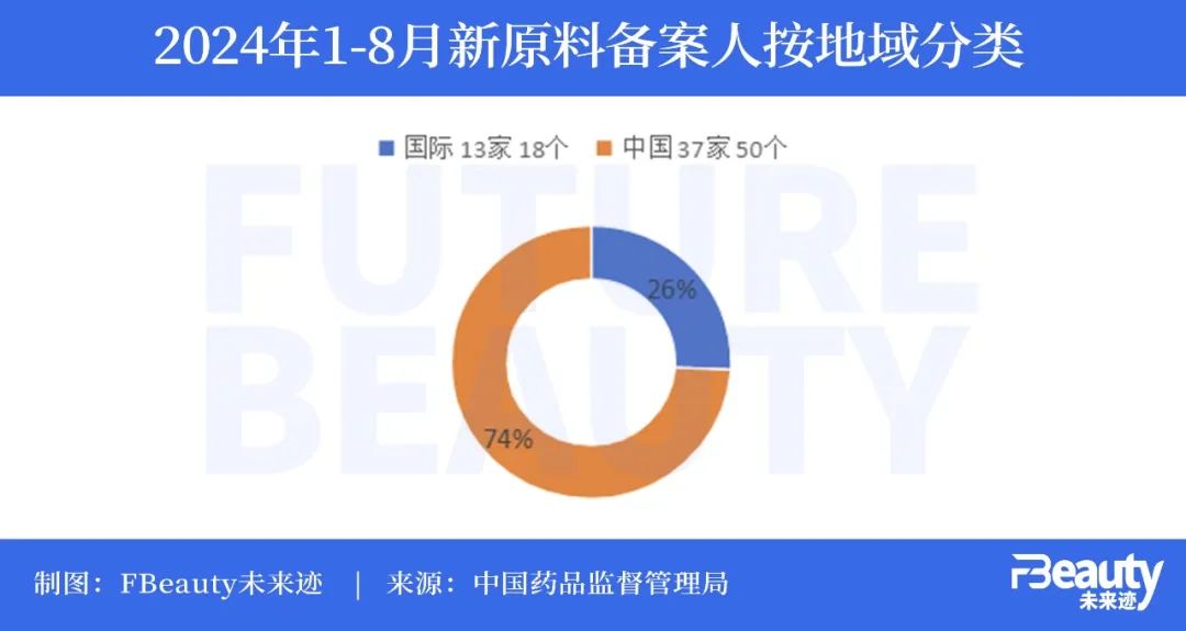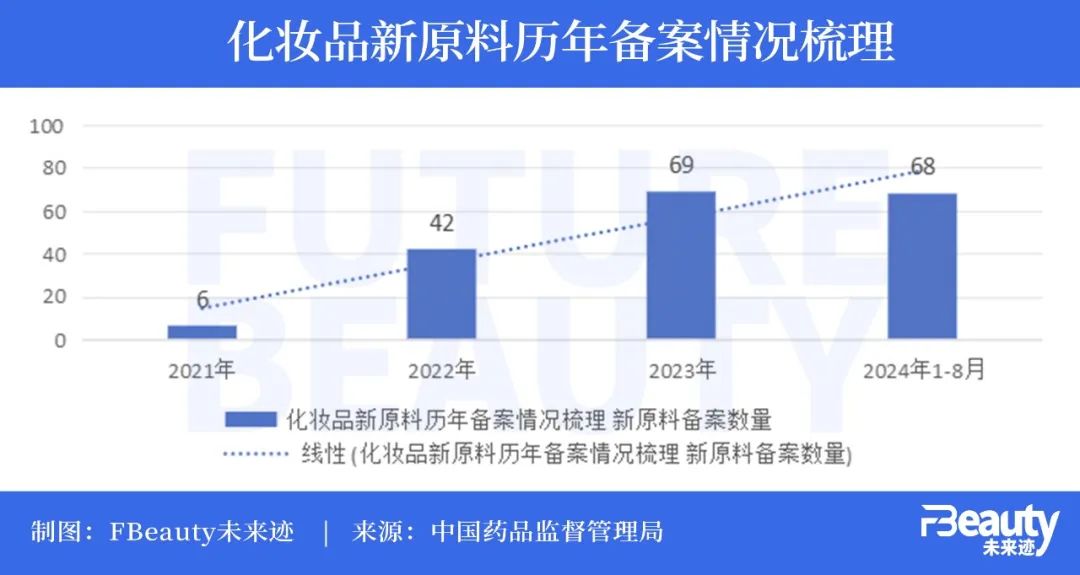 因此自2021年以來,新原料備案數(shù)量連年增加,呈現(xiàn)出“競賽升級”的大趨勢。在2024年,這種趨勢進一步升級,其中中國本土美妝品牌企業(yè)的動作尤其值得關注。
