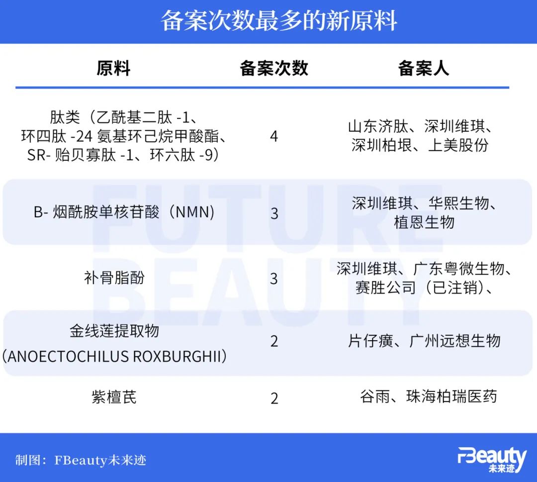 從具體成分看,備案次數(shù)最多的新原料分別是肽類、NMN、補骨脂酚、金線蓮提取物和紫檀芪。其中前三類的主要功效均為抗衰,后兩種植物提取物,金線蓮提取物功效為抗氧化、舒緩;紫檀芪是白藜蘆醇的一種衍生物,功效主要為抗氧化、美白。