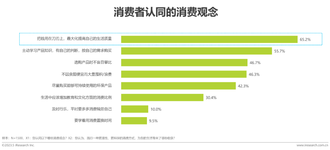 根據(jù)《2023年中國消費(fèi)者洞察白皮書》,“把錢花在刀刃上,最大化提高自己的生活質(zhì)量”成為了消費(fèi)者最認(rèn)同的消費(fèi)觀念,占比達(dá)到了65.2%。