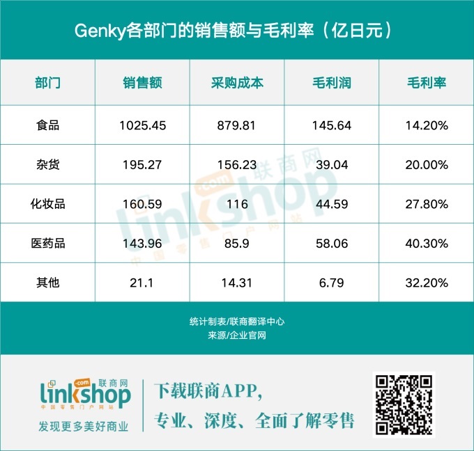 GENKY的標(biāo)準(zhǔn)化門(mén)店具備了“食品與藥品結(jié)合店”的核心結(jié)構(gòu)。雖然化妝品、醫(yī)藥品和日用雜貨等藥妝商品的銷(xiāo)售額相對(duì)較小,但由于其高利潤(rùn)率,這些商品成為門(mén)店盈利的關(guān)鍵支柱。