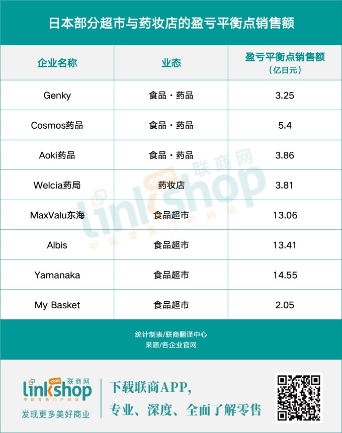 GENKY的核心運(yùn)營(yíng)模式以食品超市功能為主,以藥妝店功能為輔,在可持續(xù)性方面遠(yuǎn)遠(yuǎn)領(lǐng)先于傳統(tǒng)的食品超市。與小規(guī)模店鋪相比,GENKY同樣具有競(jìng)爭(zhēng)力。以東京的迷你超市“My Basket”為例,其店鋪規(guī)模在100㎡~270㎡之間,盈虧平衡點(diǎn)銷(xiāo)售額為2.05億日元(約合人民幣1002萬(wàn))。GENKY的店鋪規(guī)模約為其5~10倍,但盈虧平衡點(diǎn)銷(xiāo)售額僅為其1.58倍。