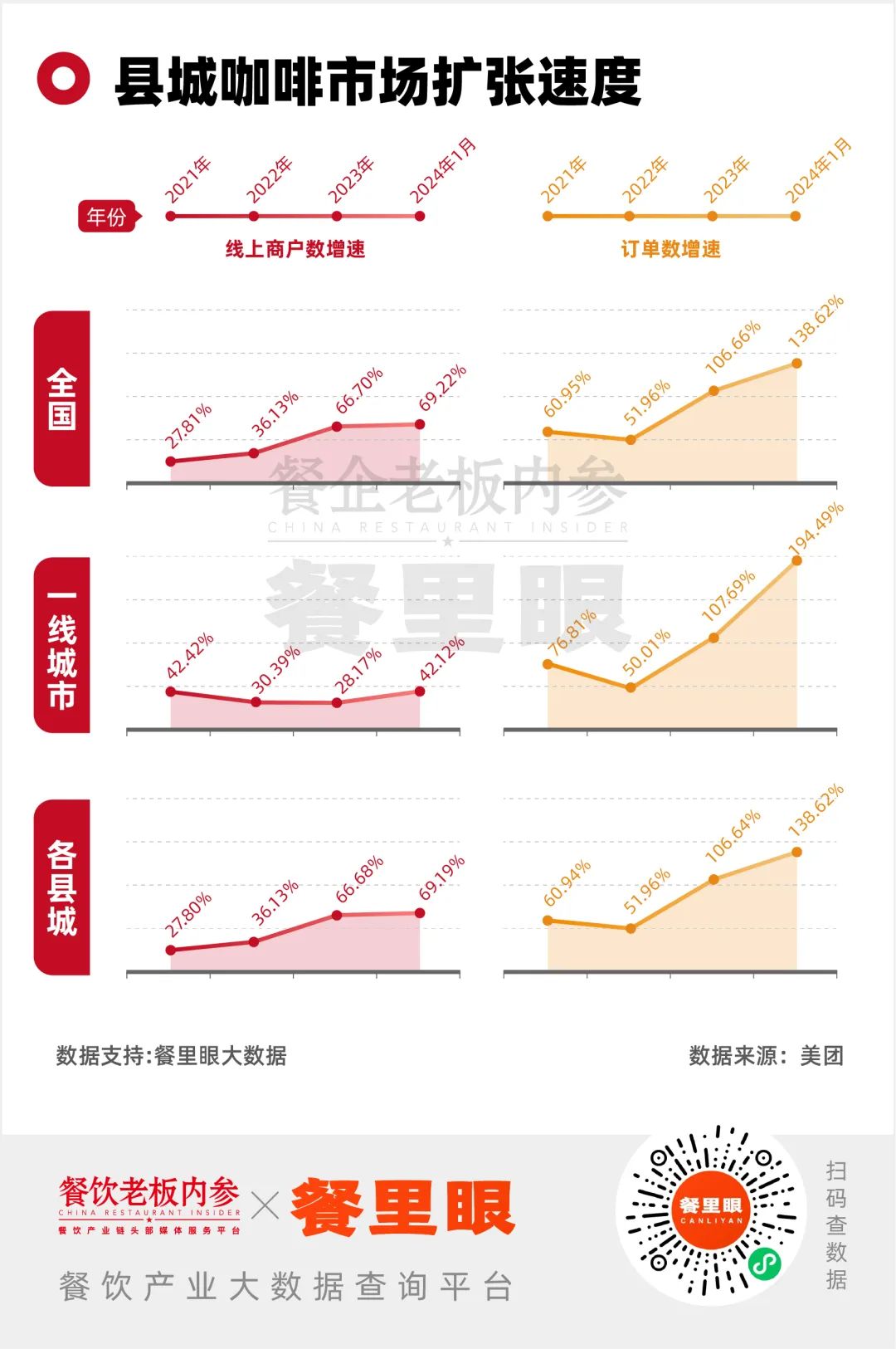 GeoQ Data 品牌數(shù)據(jù)顯示,咖啡品牌在縣域市場的門店總數(shù)約5454家,其中,有3700家左右誕生于2023年這短短的一年內(nèi);而美團(tuán)數(shù)據(jù)顯示,2021年到2024年,縣域市場的線上咖啡商戶增速,已經(jīng)從27.8%一路飆升至69.19%,并在2022年起正式超越了一線城市。線上訂單亦保持了三年高速增長。
