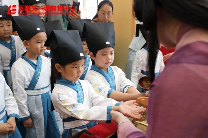 活動于當日上午10時正式拉開帷幕,通過一系列精心設(shè)計的環(huán)節(jié),將傳統(tǒng)文化與現(xiàn)代商業(yè)完美融合;顒蝇F(xiàn)場,80名身著漢服的學子在家長的陪伴下,穿過文殊門,依次體驗了沃盥禮、正衣冠、誦經(jīng)典、朱砂啟智、寫人字等傳統(tǒng)開筆禮儀式,感受了儒家文化的深厚底蘊,激發(fā)了學子們對中華優(yōu)秀傳統(tǒng)文化的熱愛與尊重。