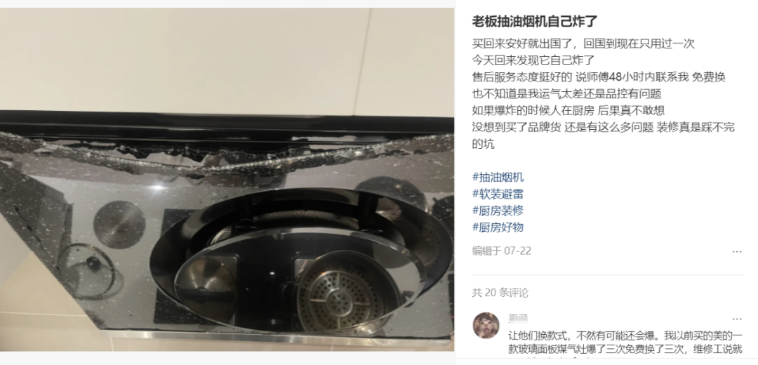 今年7月份,有網(wǎng)友在小紅書平臺發(fā)文稱,其購買的抽油煙機突然自爆。而在近幾年間,也有多起老板電器爆炸事故發(fā)生。