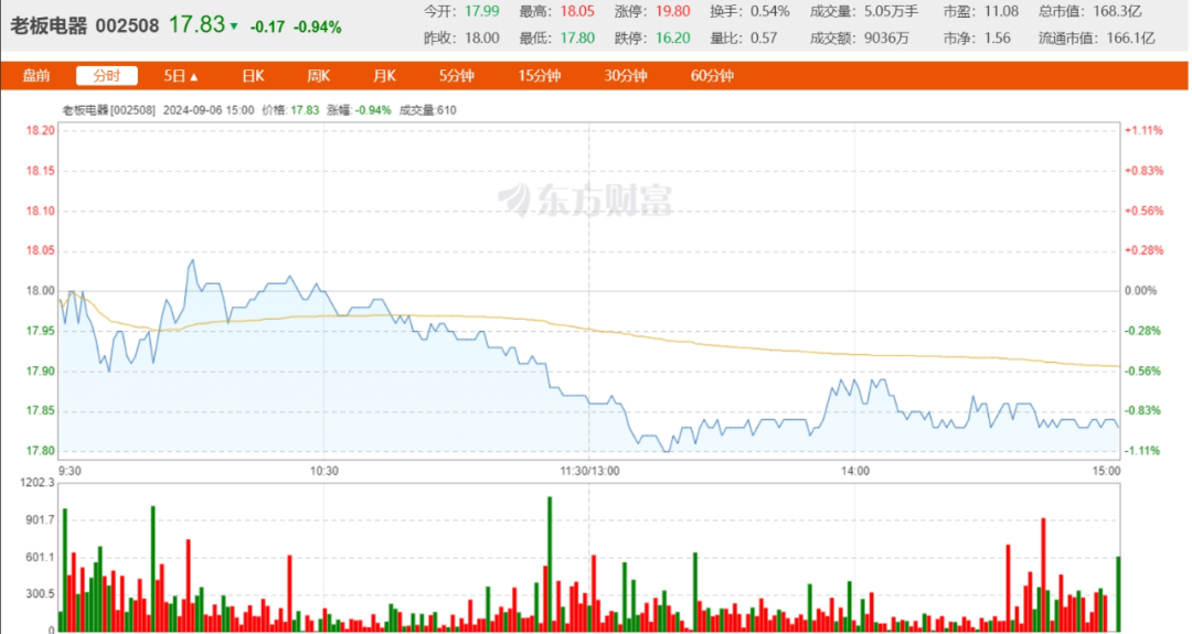 截至9月6日,老板電器報收17.83元/股,總市值168.3億元;相較今年5月20日盤中26.92元/股的高點,3個多月時間股價已下跌超30%。
