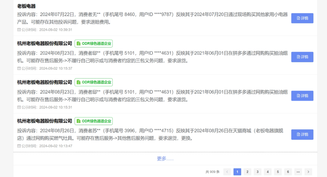 在“12315消費者投訴信息公示平臺”上,搜索“老板電器”關(guān)鍵詞顯示相關(guān)的投訴內(nèi)容多達900余條,近期的投訴內(nèi)容大多為售后服務(wù)問題;在“黑貓投訴”平臺上,“老板電器”商家頁顯示其累計投訴內(nèi)容467條,近期的投訴內(nèi)容大多為售后服務(wù)問題、虛假宣傳、產(chǎn)品質(zhì)量問題等。