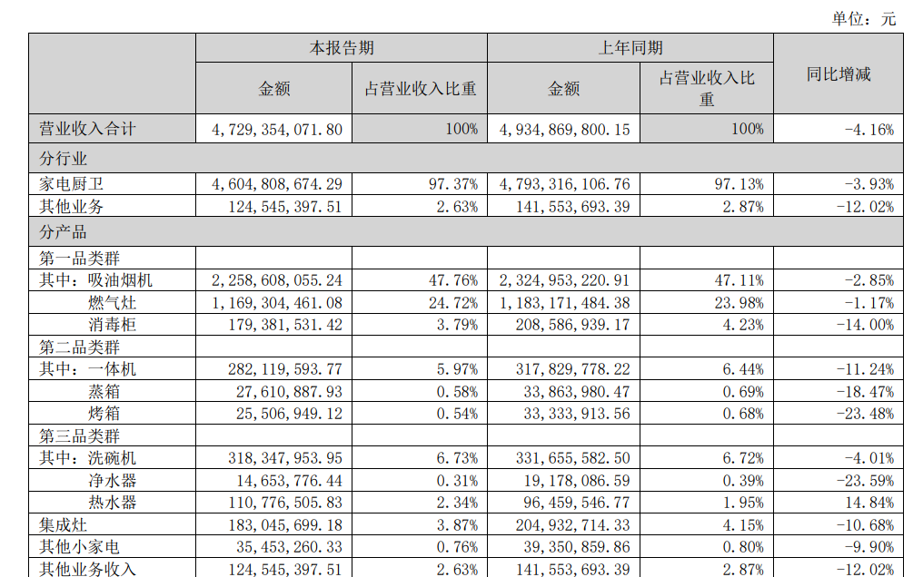 從財報數(shù)據(jù)來看,今年上半年,老板電器旗下十余個細分品類產(chǎn)品營業(yè)收入幾乎全線下滑;其中,公司第一大收入來源吸油煙機業(yè)務(wù)同比下滑2.85%,燃氣灶業(yè)務(wù)同比下滑1.17%,消毒柜業(yè)務(wù)同比下滑14%;凈水器、烤箱業(yè)績下滑幅度較大,同比分別下滑23.59%、23.48%。
