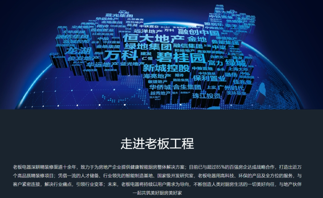 據(jù)老板電器官網(wǎng)顯示,老板電器深耕精裝修渠道十余年,致力于為房地產(chǎn)企業(yè)提供健康智能廚房整體解決方案,公司已與全國超過85%的百強房地產(chǎn)客戶達成戰(zhàn)略合作。