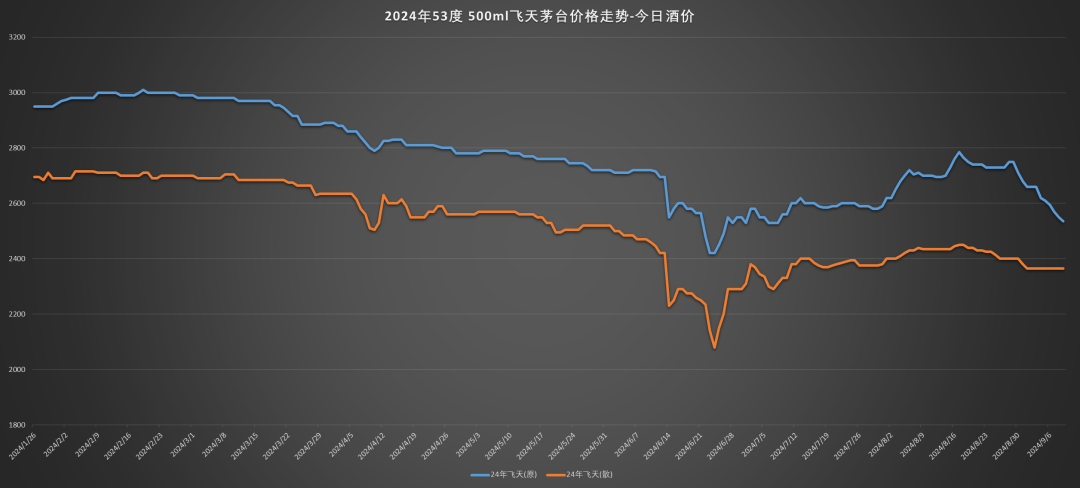但穩(wěn)價(jià)措施沒能讓飛天茅臺(tái)價(jià)格保持穩(wěn)定,進(jìn)入9月,2024年出廠的飛天茅臺(tái)(散)價(jià)格再度跌破2400元/瓶,9月9日,該產(chǎn)品價(jià)格降至2365元/瓶。同日,2024年飛天茅臺(tái)(原箱)價(jià)格降至2535元/瓶。
