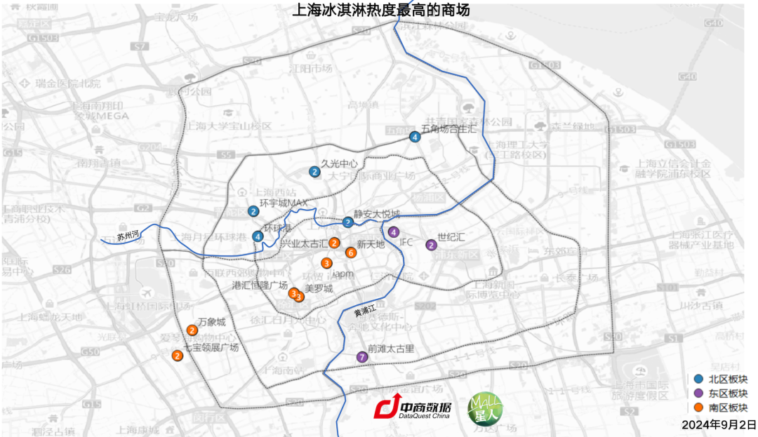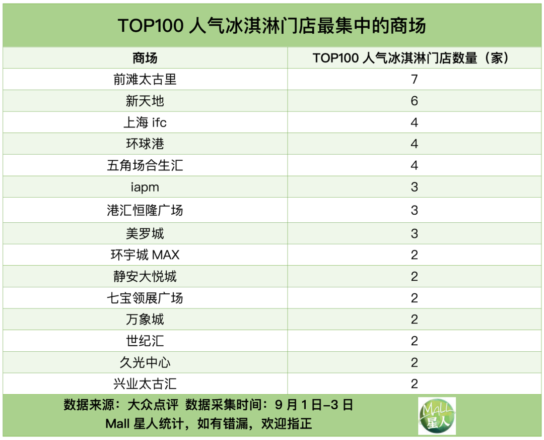 商場方面,前灘太古里、新天地、ifc、環(huán)球港、五角場合生匯、iapm、港匯恒隆廣場、美羅城、環(huán)宇城MAX、靜安大悅城、七寶領(lǐng)展廣場、萬象城、世紀(jì)匯、久光中心和興業(yè)太古匯的冰淇淋門店得分最高。