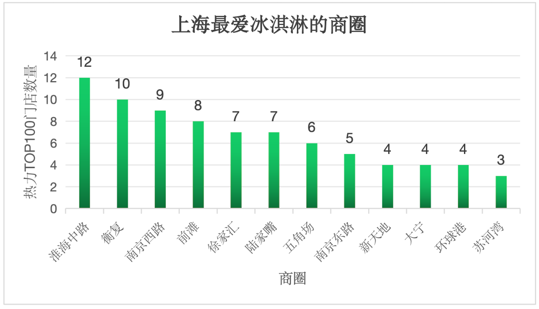 在這100家人氣冰淇淋門店中,商場店占80%,街鋪店占20%。在街鋪店中,南昌路擁有最多的3家,烏魯木齊中路、淮海中路、陜西北路各有2家。