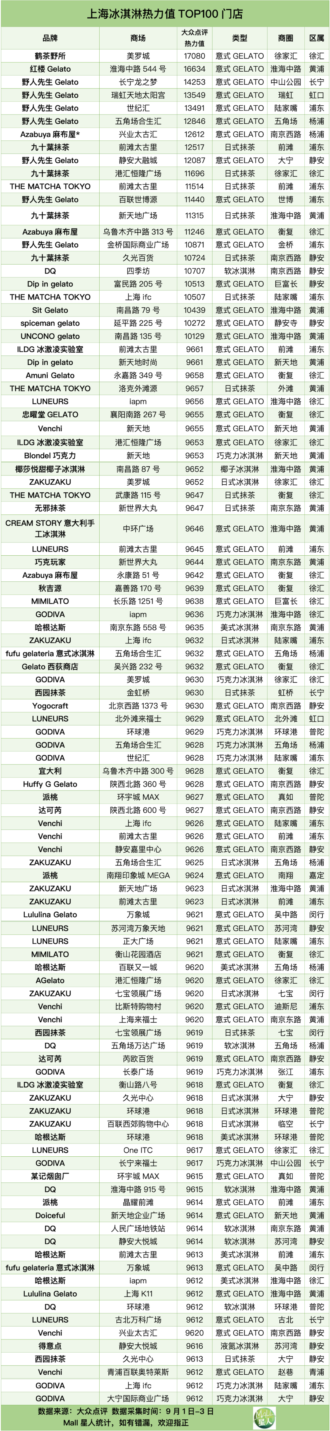 上海冰淇淋熱力值TOP100門店全名單