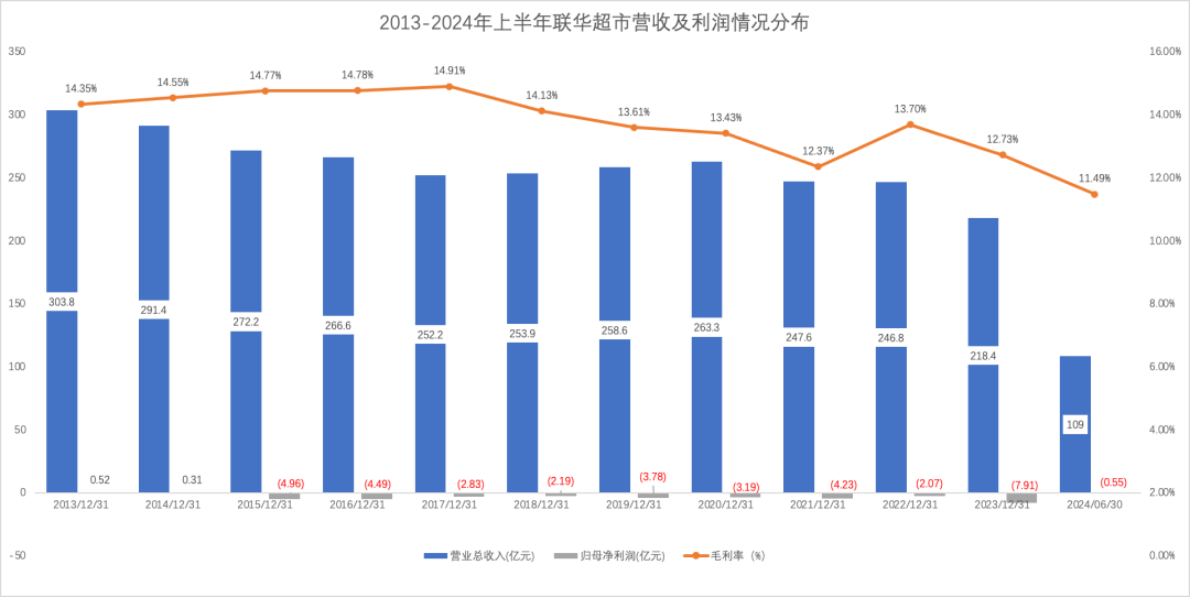 從2014到2023年,聯(lián)華超市一直未盈利,2023年創(chuàng)下歷年虧損新高,盈虧近8億元。毛利水平也屢創(chuàng)新低,2024年上半年的毛利率只有11.49%。凈利率的好轉(zhuǎn)更多來(lái)源來(lái)成本預(yù)算的管控,而不是經(jīng)營(yíng)上的開(kāi)源。