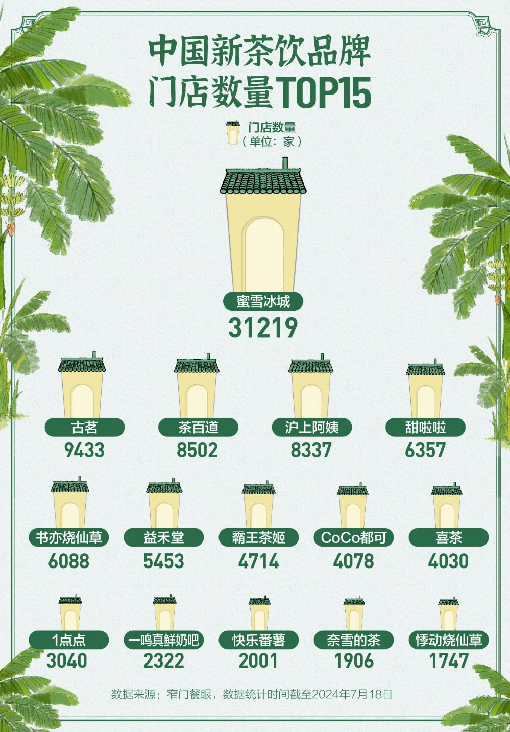 窄門餐眼數(shù)據(jù)顯示,截至2024年7月18日,中國新茶飲品牌門店數(shù)量TOP 15榜單中,奈雪的茶只擁有1906家門店,排名第十四,即將跌入“末流”。
