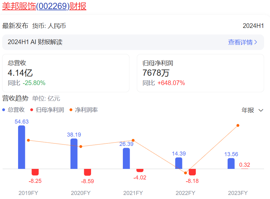 曾經(jīng)的美特斯邦威,請當紅明星代言,贊助熱門影視劇,成為了國內(nèi)幾乎人盡皆知的服飾品牌之一。然而近些年,美特斯邦威卻開始走下坡路。從業(yè)績上看,2019年到2023年,美特斯邦威總營收在持續(xù)下滑,2019年仍有54.63億元,2023年卻下滑到了13.56億元。與此同時,2019年到2022年,美特斯邦威一直處于虧損狀態(tài),累計虧損將近30億元。2023年扭虧為盈,實現(xiàn)歸母凈利潤0.32億美元。今年上半年,美特斯邦威總營收繼續(xù)下滑,但其歸母凈利潤同比增長648.07%至0.77億元。不過,財報顯示,2024年上半年,美特斯邦威的管理費用、財務費用、研發(fā)投入均同比減少,因此,有觀點認為,其上半年歸母凈利潤同比增加,可能是降本的結果。
