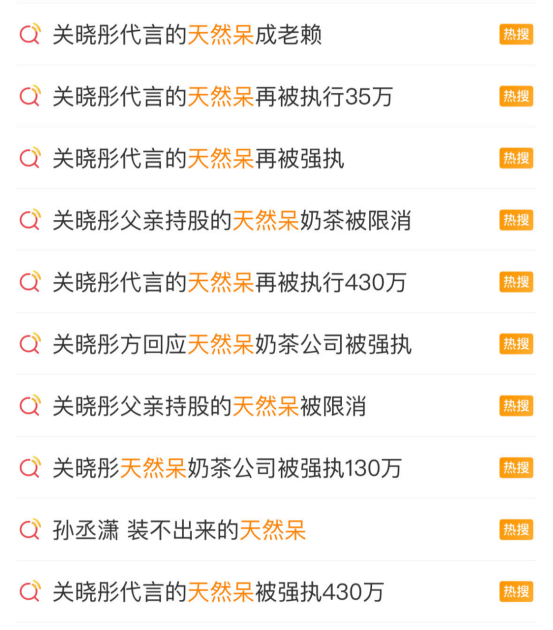 此外,“天然呆”多次因負(fù)面消息登上微博熱搜。比如“關(guān)曉彤代言的天然呆成老賴(lài)”“關(guān)曉彤代言的天然呆再被執(zhí)行35萬(wàn)”“關(guān)曉彤父親持股的天然呆奶茶被限消”“關(guān)曉彤代言的天然呆再被執(zhí)行430萬(wàn)”等。