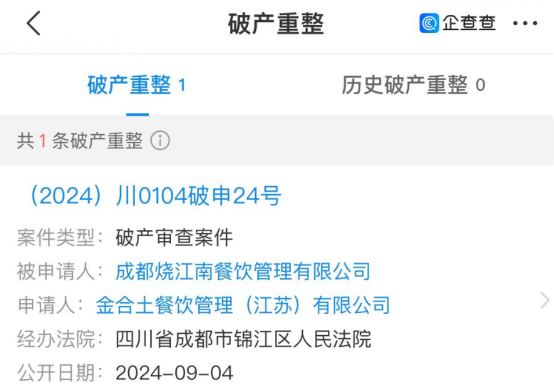 9月4日,成都燒江南餐飲管理有限公司也被金合土餐飲管理(江蘇)有限公司申請(qǐng)破產(chǎn)重整。
