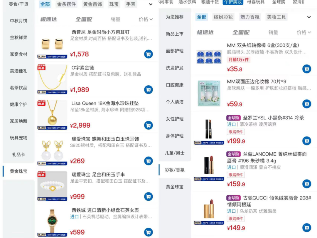 基于規(guī)模、品牌效應,山姆和大品牌供應商談判時擁有更強的議價能力,其“全球購”專區(qū)不僅匯聚了眾多知名品牌,且價格普遍遠低于官方旗艦店及第三方平臺。商品種類極為豐富,甚至包括高端黃金飾品、輕奢箱包等,滿足會員多元化的購物需求。