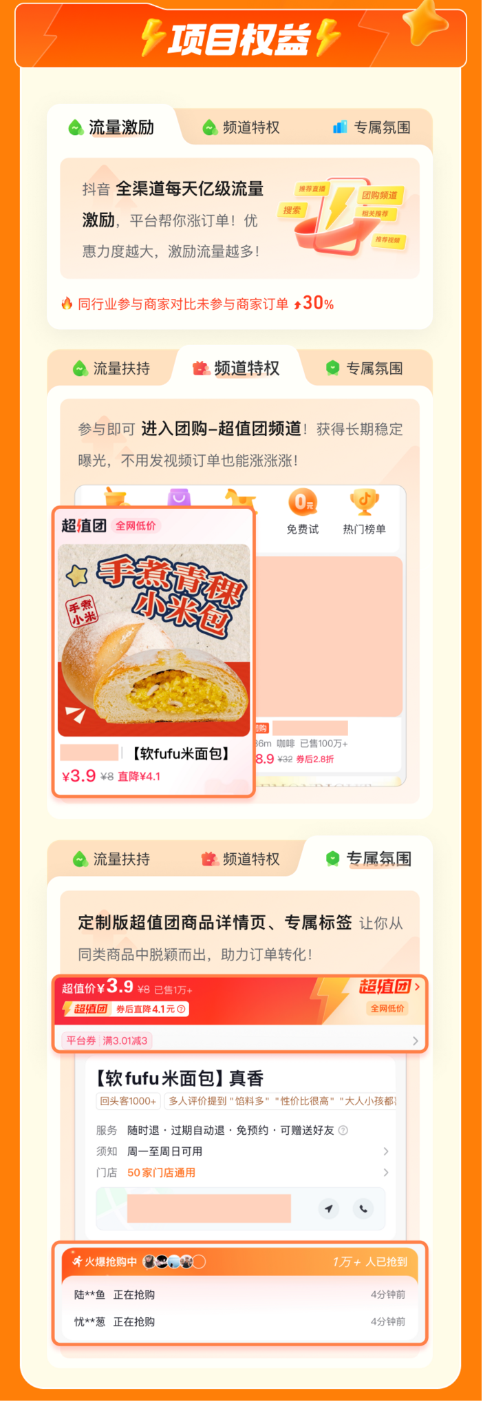 該活動(dòng)提供了諸多項(xiàng)目權(quán)益。首先流量激勵(lì)是少不了的,據(jù)了解,參與活動(dòng)的商家可以獲得抖音全渠道每天億級(jí)流量激勵(lì)。商家還能享受專屬頻道頁(yè)、超值團(tuán)標(biāo)簽。