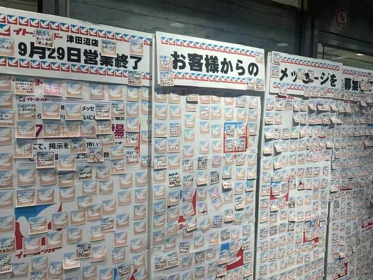 在即將關(guān)閉的店鋪中,引起廣泛關(guān)注的是9月29日要關(guān)閉的伊藤洋華堂津田沼店,誕生于 1977 年,到2024年走過 46 個(gè)年頭了,當(dāng)?shù)叵M(fèi)者聚集在廣場,表達(dá)不舍之情,店內(nèi)通道墻上專門設(shè)置一個(gè)區(qū)域,貼滿了征集來的顧客的回顧式留言。