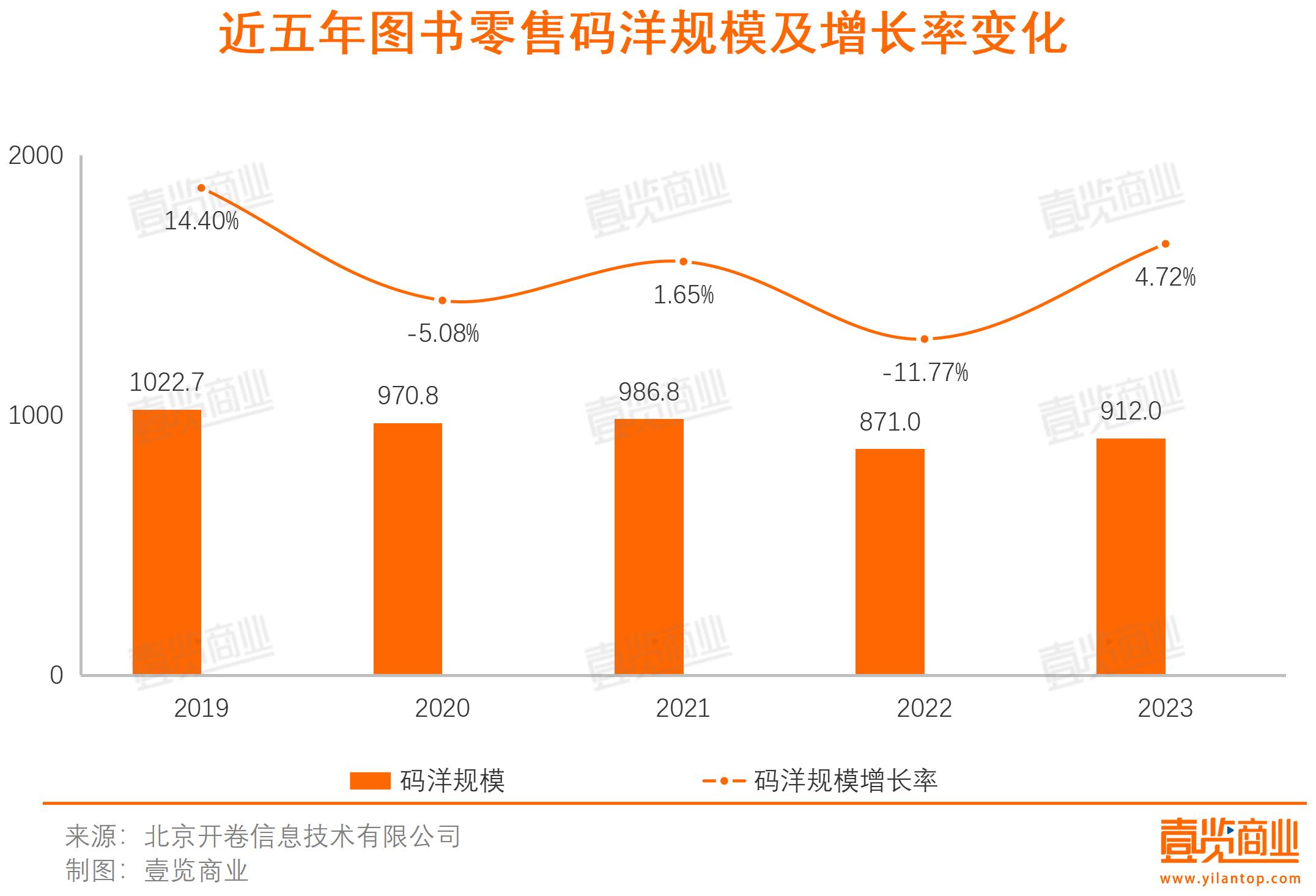 從行業(yè)整體來看,圖書整體銷售數(shù)據(jù)不佳。自2020年起,圖書零售總體規(guī)模出現(xiàn)20年來首次下降,也從1000億的量級上跌落;2021年圖書市場同比僅增長了1.65%,處于原地踏步狀態(tài);2022年同比下降11.77%,降幅超過了2020年,市場規(guī)模倒退到2018年的水平,跌破900億元關(guān)口;2023年略有回升,但依舊未恢復(fù)到疫情前水平。