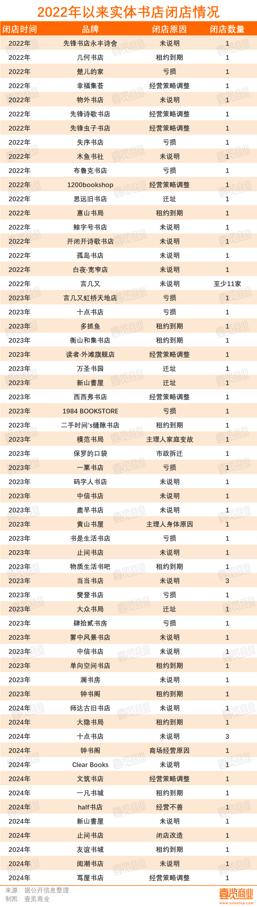 在這種情況下,實(shí)體書店自然活不下去。據(jù)壹覽商業(yè)不完全統(tǒng)計(jì),2022年以來,至少關(guān)閉了74家實(shí)體書店,其中不乏言幾又、十點(diǎn)書店、先鋒書店這類紅極一時的書店,據(jù)披露,言幾又曾獲得4輪融資,融資額超過2億,最高峰開了60家門店,如今所剩無幾。