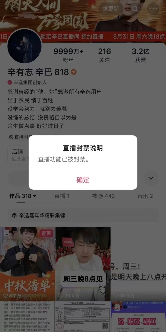 近日,辛巴和小楊哥糾紛不斷,辛巴此前表示將于9月11日晚8點(diǎn)直播賠付1億并回答網(wǎng)友問題,但在當(dāng)晚7時(shí)40分左右,有網(wǎng)友發(fā)現(xiàn)辛巴快手賬號(hào)直播功能已被封禁。