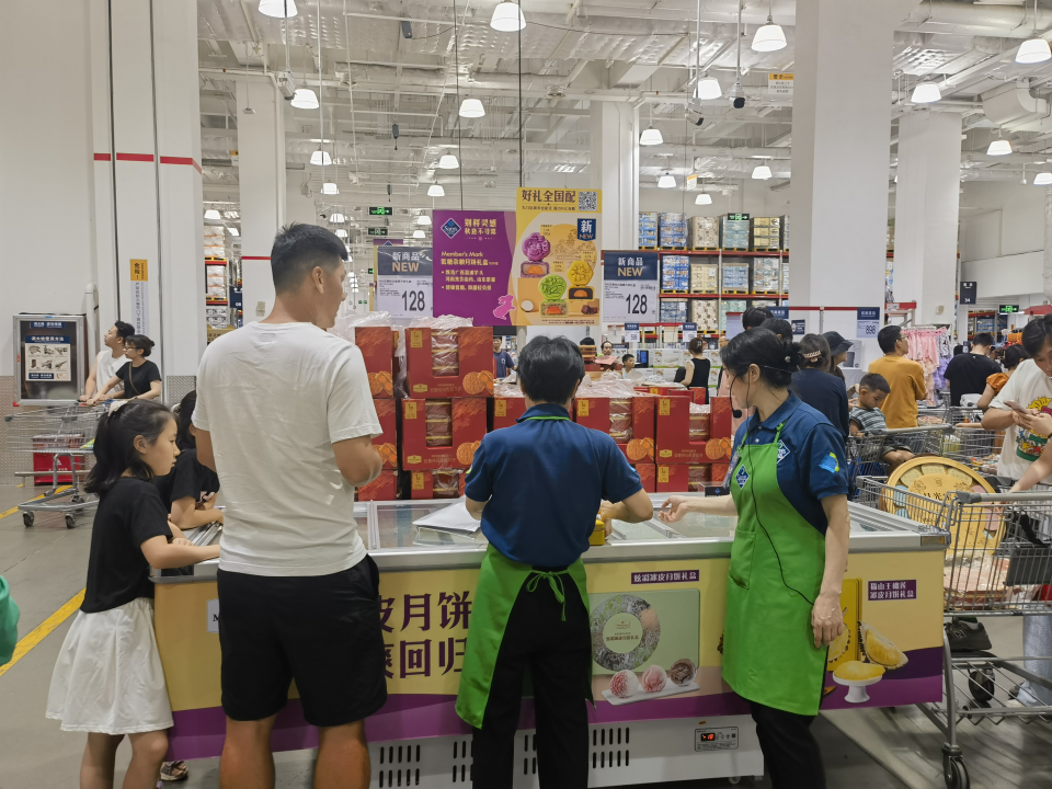 再者,在本土化運(yùn)營(yíng)上,進(jìn)入中國(guó)28年的山姆也具備更深厚的經(jīng)驗(yàn)。臨近中秋節(jié),在Costco杭州店內(nèi),并未看到明顯的節(jié)日元素和主題陳列。相比之下,山姆則深諳此道,抓住了會(huì)員的送禮需求,不僅在進(jìn)店入口處就堆放了月餅禮盒,且在賣(mài)場(chǎng)過(guò)道處設(shè)置了月餅專(zhuān)區(qū),并提供相應(yīng)的包裝和全國(guó)配送服務(wù)。