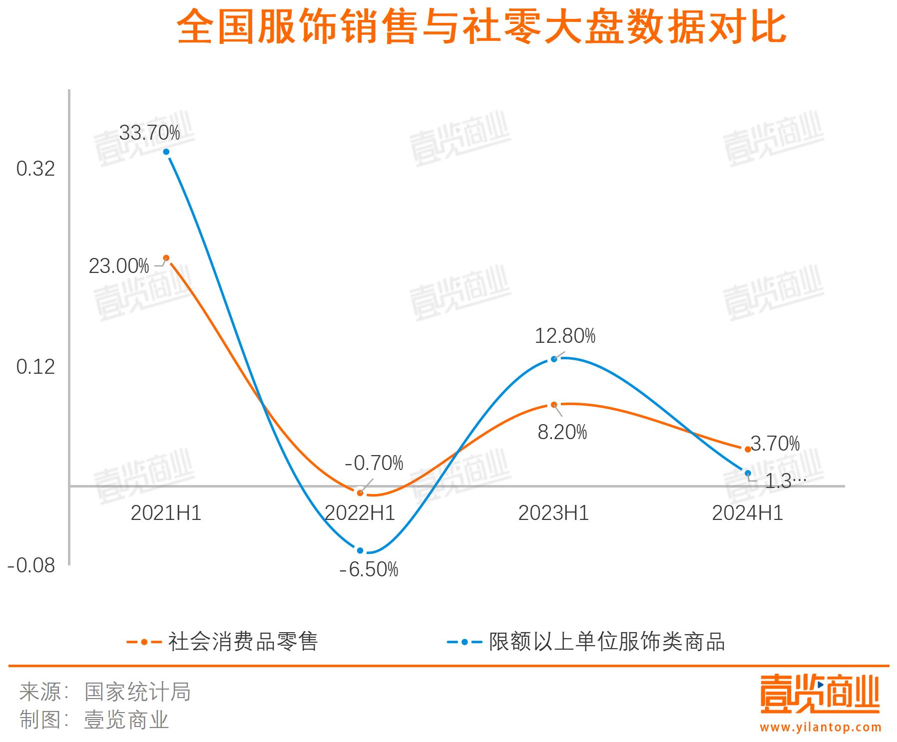 國家統(tǒng)計局?jǐn)?shù)據(jù)顯示,上半年社會消費品零售總額同比增長3.7%,限額以上單位服裝、鞋帽、針紡織品類商品的零售額同比增長1.3%,增速整體低于平均水平,且比 2023 年全年放緩 11.6個百分點。