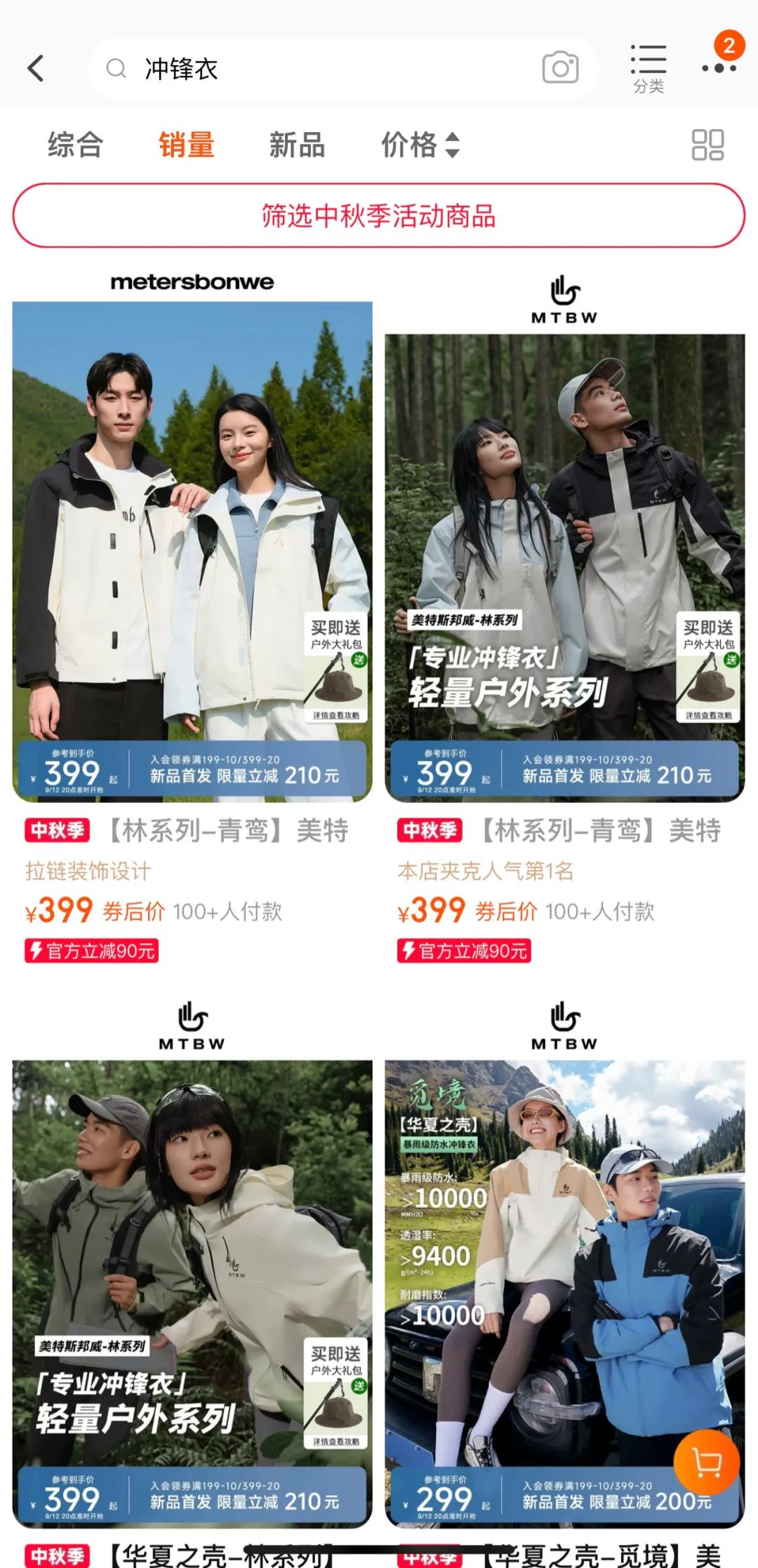 《聯(lián)商網(wǎng)》查閱美邦天貓旗艦店發(fā)現(xiàn),銷售最高的是一款售價(jià)39元的T恤,目前已售4萬(wàn)+,以「沖鋒衣」作為關(guān)鍵詞在店內(nèi)搜索,銷量最高的一款沖鋒衣為「林系列——青鸞」,目前已售200件,這或許意味著美邦在戶外還有很長(zhǎng)的路要走。